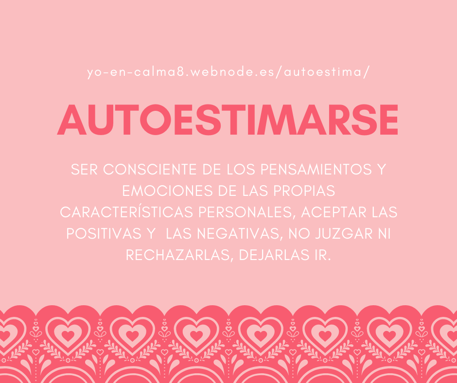 "Yo en calma" considera principalmente la autoestima como los pensamientos, sentimientos, sensaciones y experiencias que se recopilan a lo largo de nuestra vida en relación a nuestras habilidades, cualidades, características personales... y Autoestimarse es ser consciente de los pensamientos y emociones de las propias características personales, aceptar las positivas y las negativas, no juzgar ni rechazarlas, dejarlas ir.