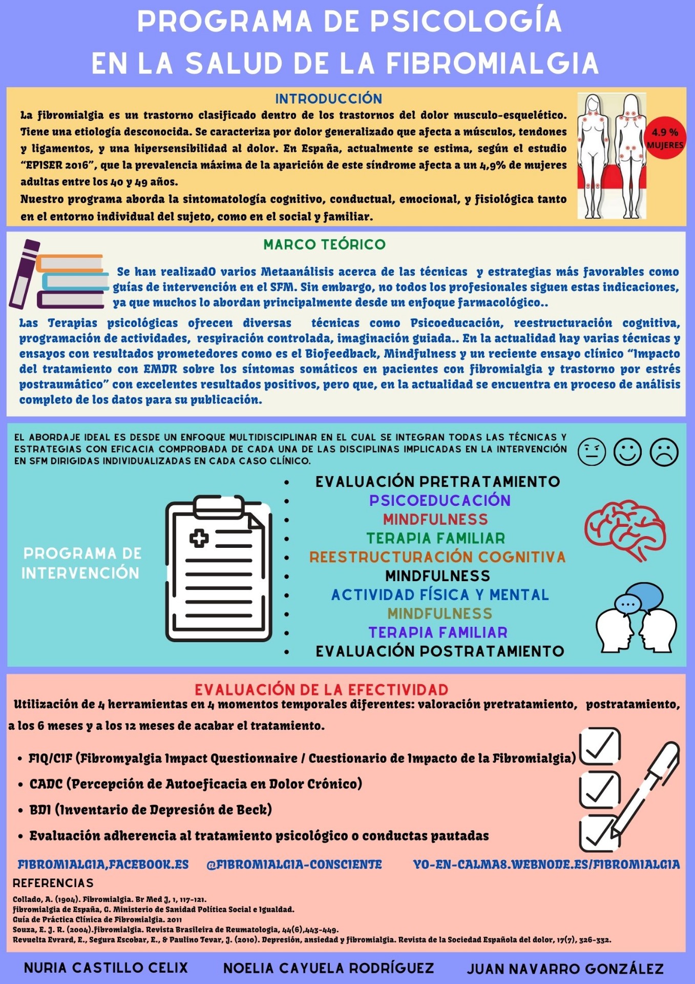 También se propone desde las redes sociales la participación de una persona que padece fibromialgia para que colabore aportando su experiencia y poder también hacer eco a través de ella a otras personas que sufren fibromialgia desde dichas redes para ejemplificar un caso de otros muchos que existen y lograr difundir mayor información. Desde los programas de psicología en la salud y con la utilización de los recursos tecnológicos como herramienta se considera importante divulgar información de calidad y eficiente.